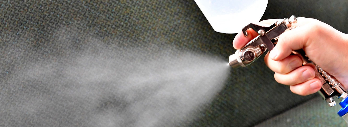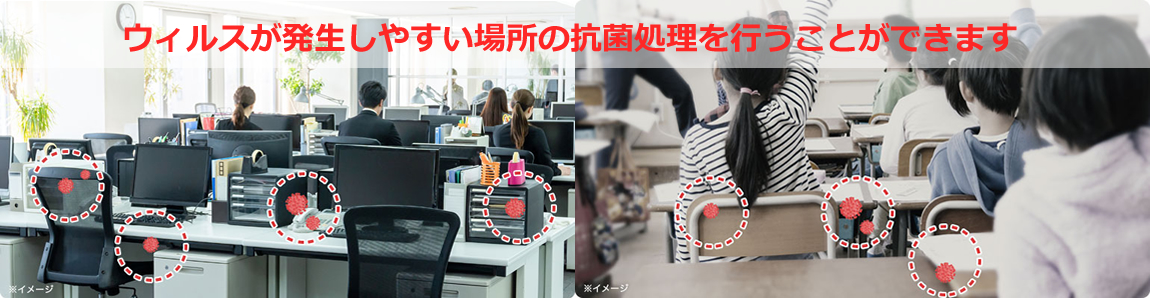 接触感染の感染源となるドアノブやエレベーターのボタン等は、不特定多数が触れる為、日々の消毒では対策に限界があります。また、机の裏や、手すりの隙間の拭き残しなども感染源となります。【キノシールド】は、専用のスプレーガンを使用して、コーティング剤を霧状に噴霧することで溶液の粒子を天井の高さまでムラなく充満させます。床・壁をはじめ、ドアノブから電話機やPCキーボードなどの人が触れる全てのモノに細かな粒子が隅々まで潜り込んで室内全体をまるごとコーティングします。