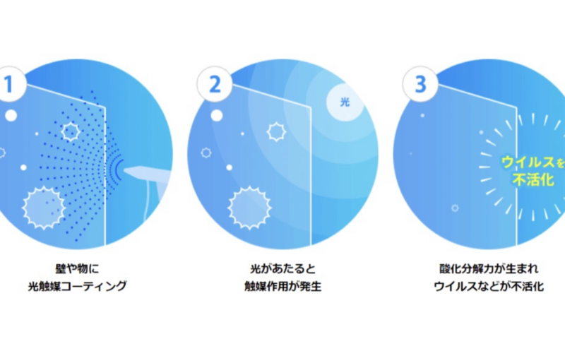 キノシールド施工で使用されているコーティング剤は、酸化チタン・抗菌効果・防臭効果の相乗効果があります。