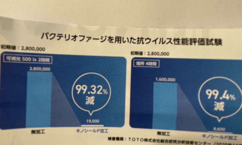 キノシールドの施工に使用する光触媒コート剤は、太陽や照明の光に反応し、有害な物質を2時間で99.3%抑制します。