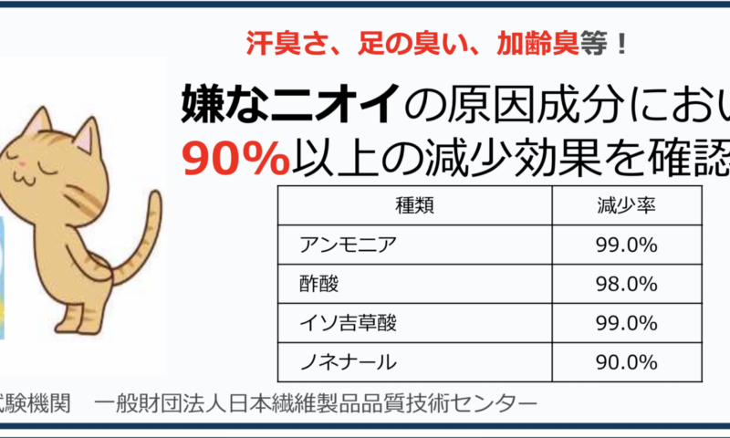 キノシールドは、嫌なニオイの原因成分を90%以上減少させる効果もあります。