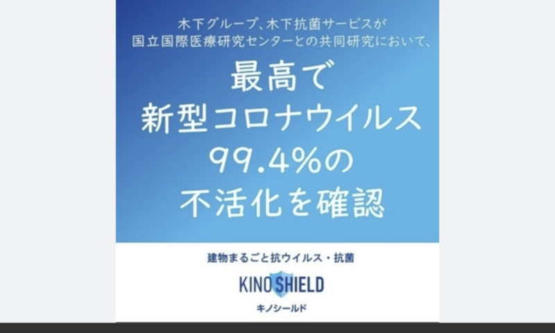 キノシールド施工は、30分後には99.4%の新型コロナウイルスを不活性化します。