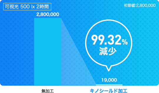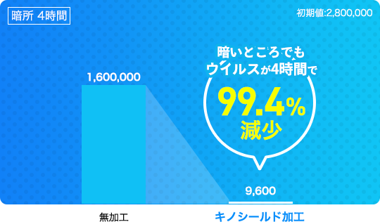 【キノシールド】は、ウイルス・菌が触れた瞬間から働き始め、光が当たる場所では2時間で約99.32%、暗い場所でも4時間で約99.4%不活性化させます。